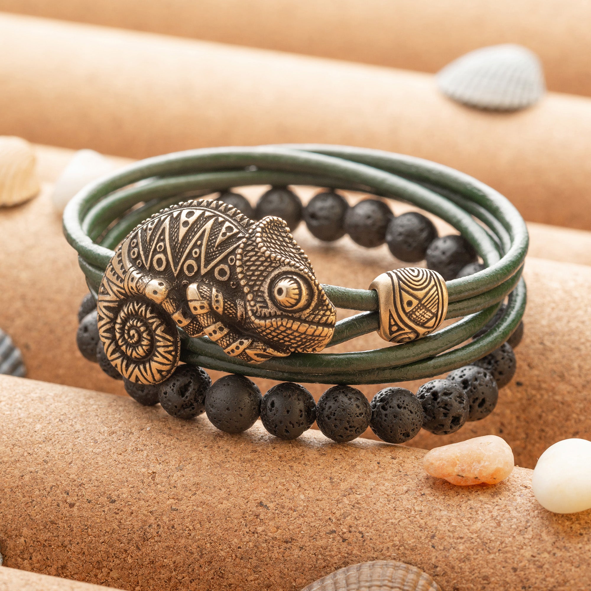 Chameleon & Lava Beads Bracelet Set – Handmade Tribal Jewelry