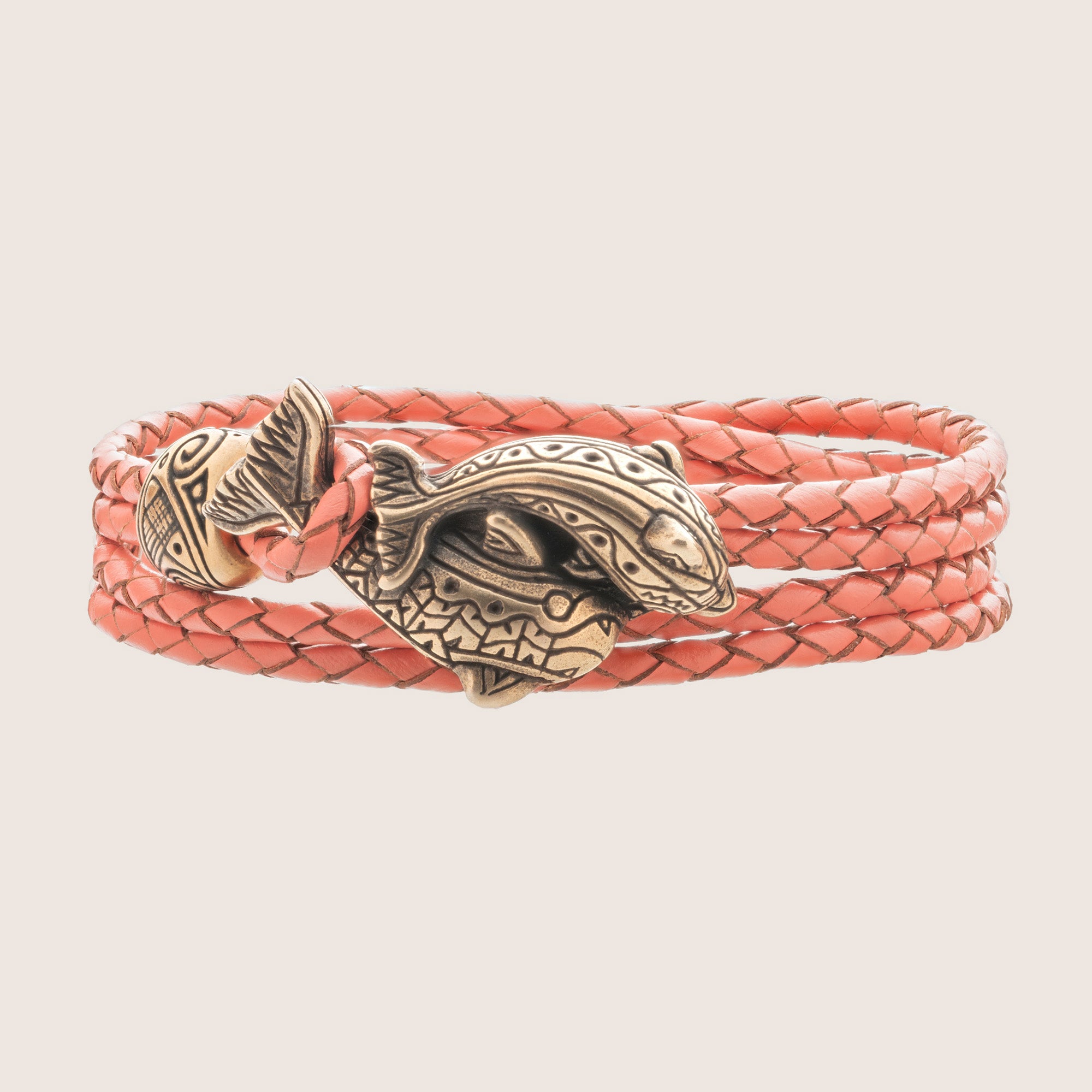 Made from genuine leather braided cord and completed with a solid bronze dolphin clasp, this bracelet unites the raw beauty of nature with enduring craftsmanship. Its tribal-inspired design reflects harmony, resilience, and the timeless rhythm of the sea.